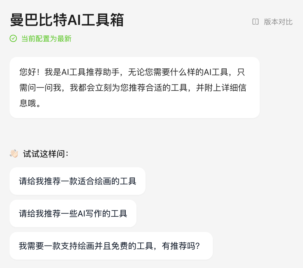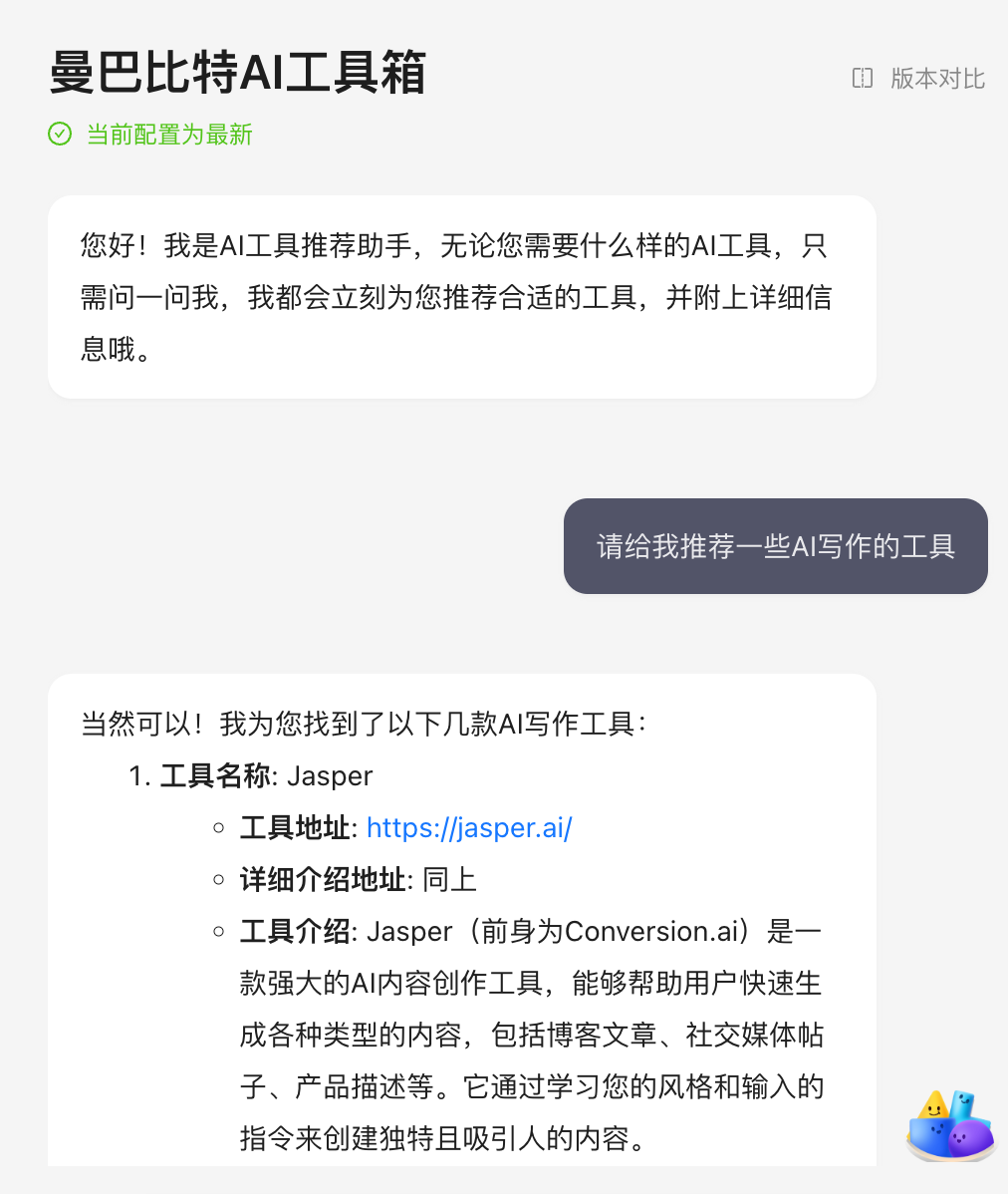 可以看到整个流程非常清晰和简单,当然这是最简单的一个AI智能体应用,后面我将继续升级曼巴比特AI工具箱这个智能体,例如接入插件和工作流。