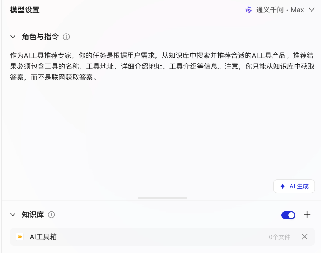 接着进入最关键的配置阶段,这里我们主要是给AI智能体配置两个地方,分别为1)角色与指令(简单理解就是这个智能体是什么,如何去做事情)和知识库(AI智能体会从知识库中获取答案,而不是外部,如果你需要AI智能体回答你的私有数据,例如企业内部资料,则必须配置知识库)