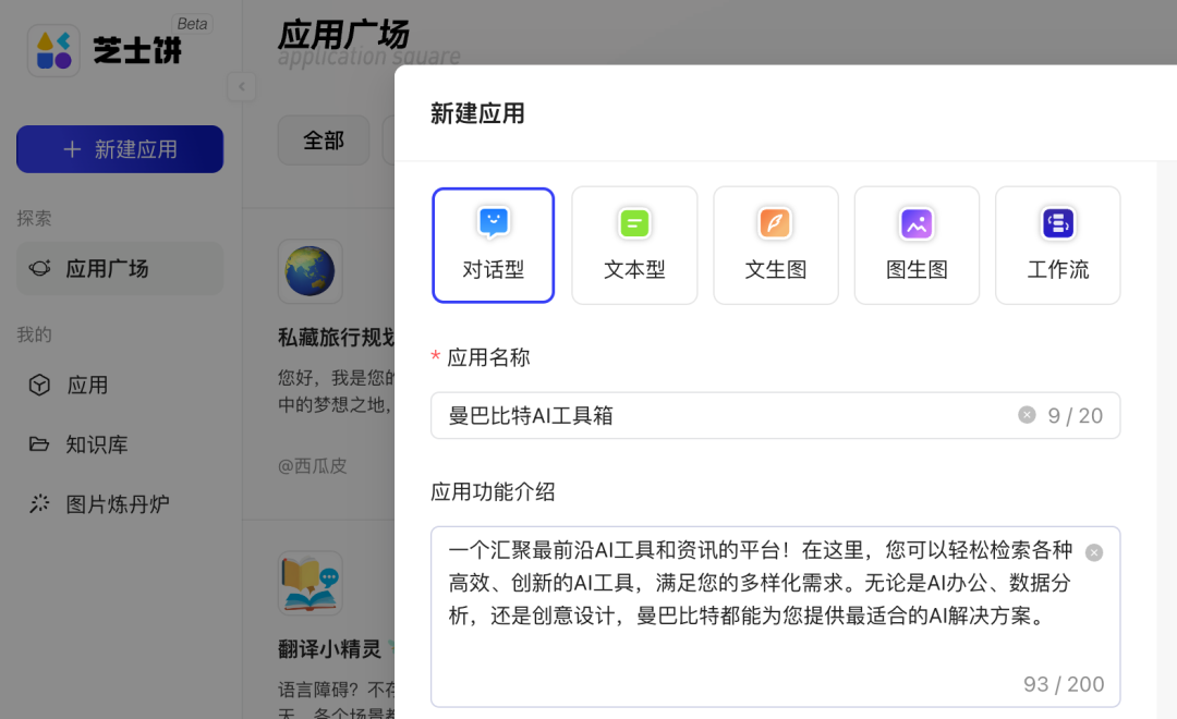 平台支持多种类型的AI应用开发,如对话型、文本型、文生图、图生图和工作流等。无论是要创建一个智能客服,还是构建一个自动生成内容的工具,芝士饼都能为你提供适合的AI模型,帮助你快速实现创意。