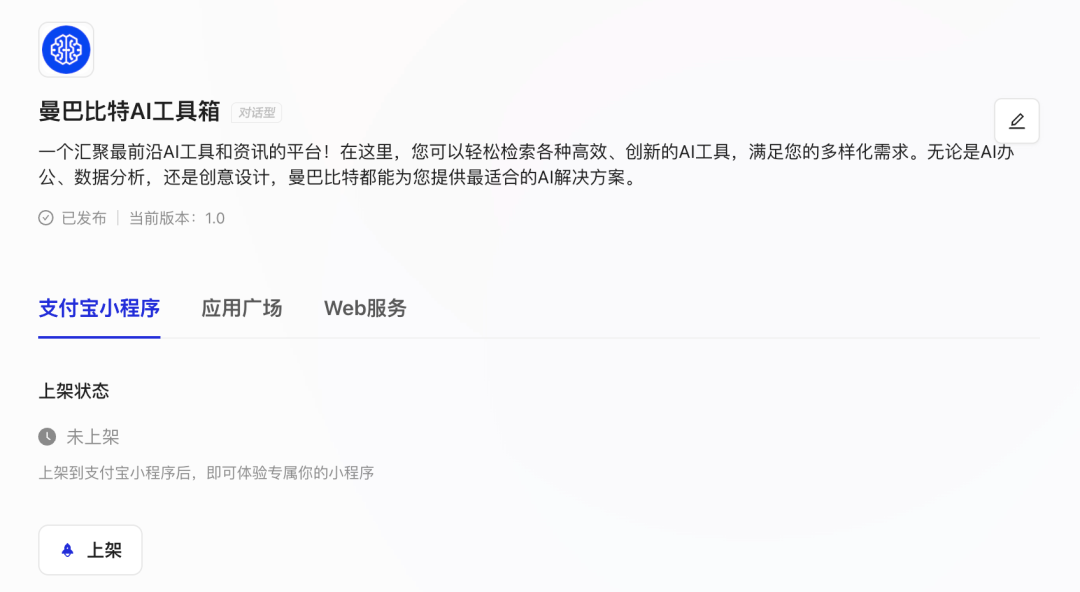 如果觉得没有问题之后,则点击右上角的发布,这里的发布,其实是创建成功,这个时候只有你自己能使用这个曼巴比特AI工具箱这个智能体,如果要想被其他人使用,芝士饼AI平台提供了三个方式,分别是发布到支付宝小程序、应用广场、Web服务三个方式。这里最大的特色即是支付宝小程序,这是芝士饼AI平台独有的,像腾讯的混元智能体平台的智能体,目前是不能发布到微信小程序中去的。
